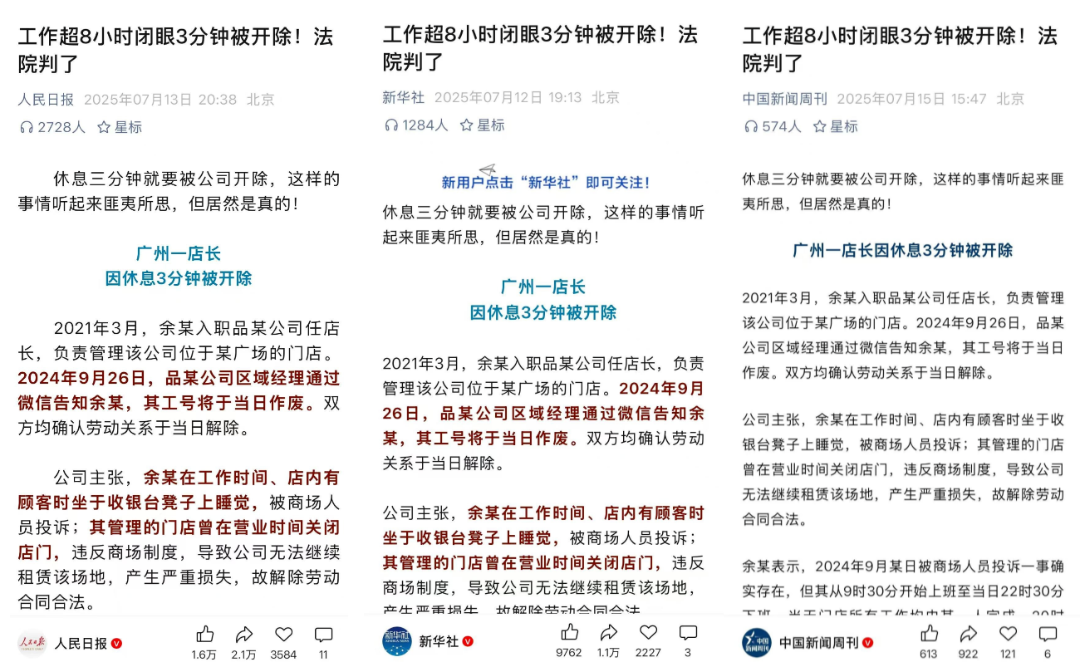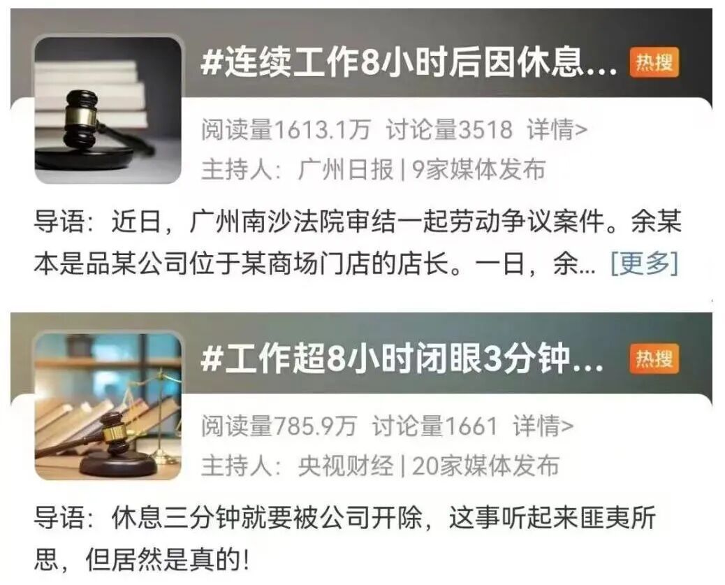 报告中提及:“依法规制不合理考核辞退员工行为。余某连续工作超8小时、公司未安排人员接替,因闭眼小憩3分钟被辞退,广东法院认定构成违法解除劳动合同。”